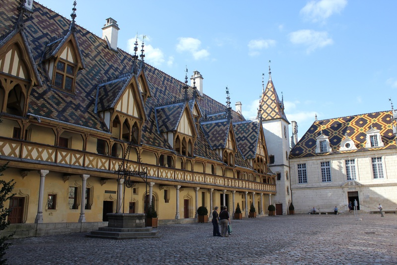 Wir verabschieden uns von Vézelay und fliegen über die Autobahn gen BEAUNE. Hier leuchten die Herbstfarben vom Dach des Hôtel Dieu, das den wunderbaren Weltgerichtsaltar von Rogier